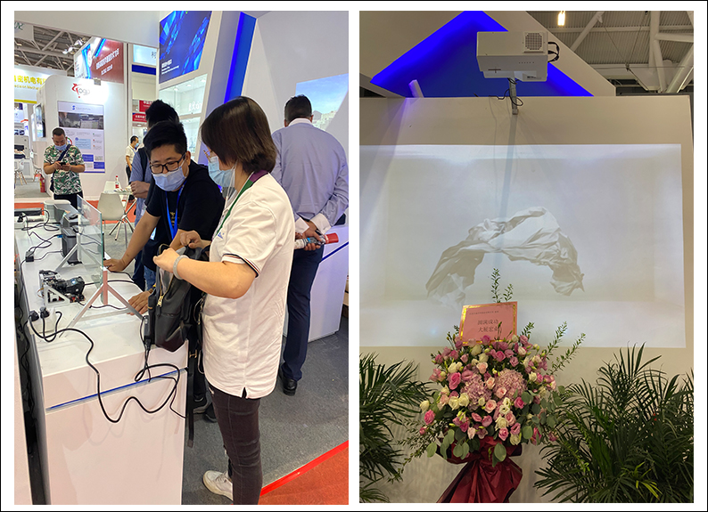 在7號館7B21區,安華光電攜帶新品HY37H超短焦、P13HGA、F26GF_MFB、F57等光學模組,向參展觀眾展示其投影效果,憑借著小巧的形象以及穩定的性能,頻頻獲得參展觀眾的關注,吸引了眾多客商的駐足觀看與咨詢洽談。